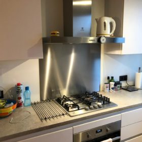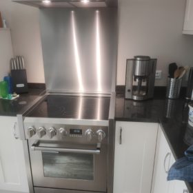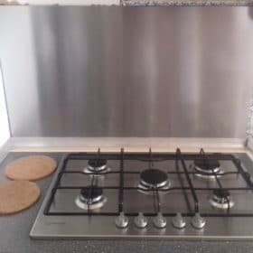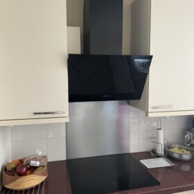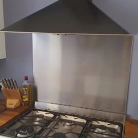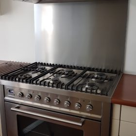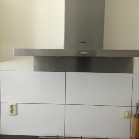 Rvs achterwand. Netjes en super op tijd geregeld. Jammer dat de lijm was uitgedroogd. Die heb ik vanwege de tijd zelf maar weer gekocht.
