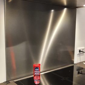 De achterwand op maat kan eenvoudig op de muur bevestigd worden.De meegeleverde vochtwerende mdf plaat word aan de muur bevestigt met pluggen en schroeven. De achterwand op maat wordt over het hout verlijmd, geen schroeven in het zicht. Direct de juiste montagematerialen mee bestellen? Wij lever ms polymeer lijm in tube of koker en dubbelzijdig tape voor snelle en betrouwbare montage van je rvs plaat op maat.