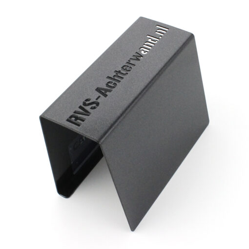 De rvs plaat is voorzien van een zwarte poedercoating met een mat oppervlak en voorzien van een anti-fingerprint werkende coating.