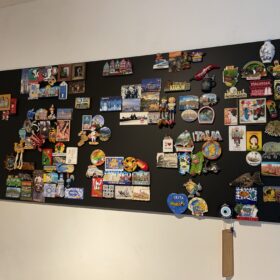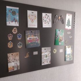Magneetbord van 150×60 cm voor onze verzameling reis- en vakantie herinneringen. Ophangen was eenvoudig met de meegeleverde beugels, pluggen en schroeven.